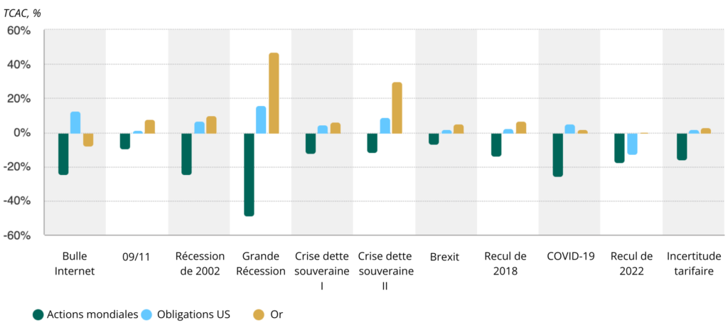 *Au 31 décembre 2025. Calculs des rendements en dollars américains pour les « actions mondiales » : indice FTSE All World ; « bons du Trésor américain » : indice Bloomberg Barclays US Treasury ; « or » : cours de l’or LBMA PM. Dates utilisées : bulle Internet : 3/2000 – 3/2001 ; 11 septembre : 9/2001 ; récession de 2002 : 3/2002 – 7/2002 ; crise financière mondiale (CFM) : 10/2007 – 2/2009 ; crise de la dette souveraine I : 1/2010 – 6/2010 ; crise de la dette souveraine II : 2/2011-10/2011 ; Brexit : 23/6/2016 – 27/6/2016 ; Recul de 2018 : 10/2018 – 12/2018 ; Recul de 2020 : 31/1/2020 – 31/3/2020 ; Recul de 2022 : 1/2022 – 12/2022, Incertitude tarifaire : 18/2/2025 – 8/4/2025.