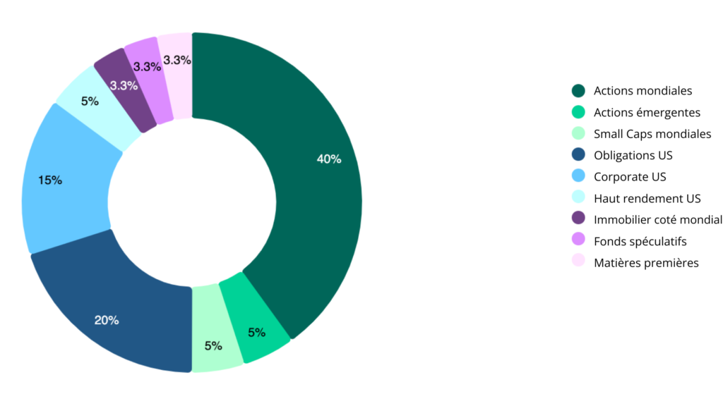 3. Portefeuille agressif : 65 % d’actions (52 % MSCI Global, 6,5 % MSCI EM et 6,5 % MSCI Small Cap) ; 20 % d’obligations (10 % Bloomberg US Treasuries, 7,5 % Bbg US Corporates, 2,5 % Bbg US High Yield) ; 15 % d’actifs alternatifs (5 % FTSE REITs Index, 5 % HFRI Hedge Fund Index, 5 % Bloomberg Commodity Index).