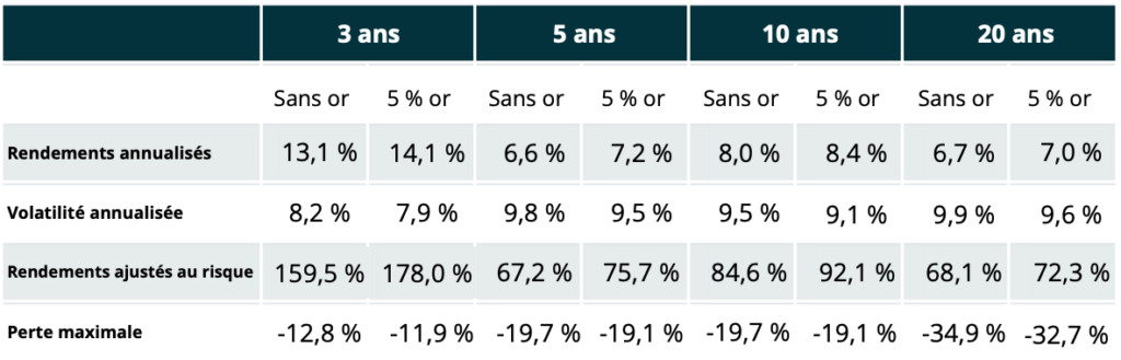 Comparaison entre un portefeuille hypothétique en USD et un portefeuille équivalent contenant 5 % d’or au cours des 3, 5, 10 et 20 dernières années, sur la base des rendements en dollars américains*