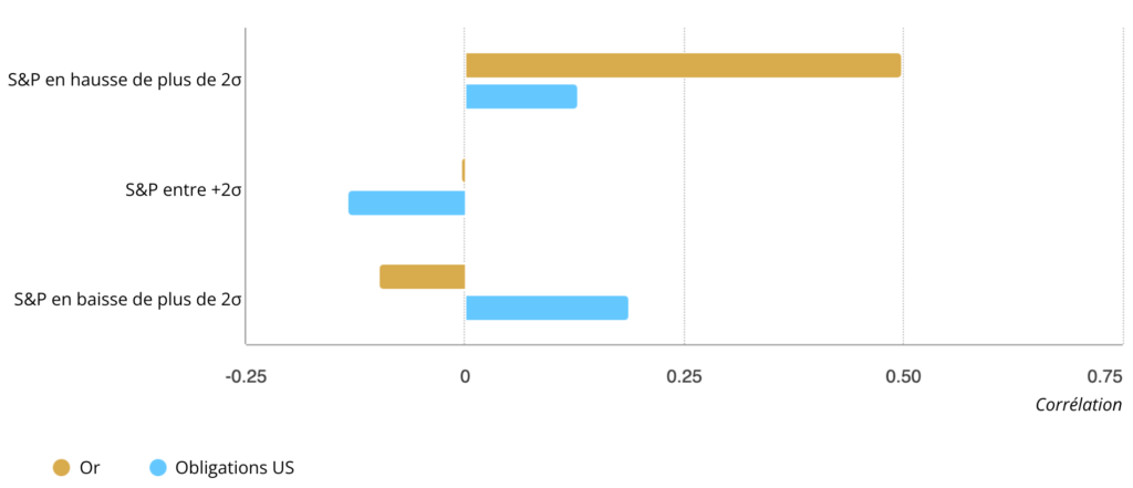 *Au 31 décembre 2025. Corrélations basées sur les rendements hebdomadaires en dollars américains pour les « actions » : indice S&P 500 ; « bons du Trésor américain » : indice Bloomberg Barclays US Treasury, et « or » : LBMA Gold Price PM depuis janvier 1994 en raison de la disponibilité des données du Trésor américain. La barre supérieure correspond aux corrélations respectives lorsque les rendements hebdomadaires du S&P 500 augmentent de plus de deux écarts-types. La barre du milieu correspond aux corrélations respectives lorsque les rendements hebdomadaires du S&P 500 se situent entre deux écarts-types (ou « σ »), tandis que la barre du bas correspond à la corrélation respective lorsque les rendements hebdomadaires du S&P 500 baissent de plus de deux écarts-types. L’écart-type du S&P 500 est calculé à partir des rendements hebdomadaires sur l’ensemble de la période.