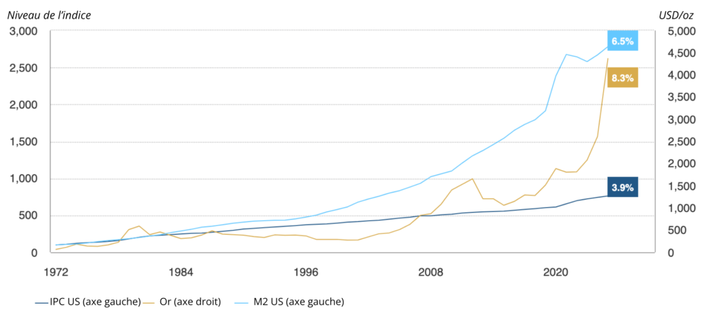 *Au 31 décembre 2025. L’IPC américain et la masse monétaire M2 américaine ont été calculés à partir des données disponibles depuis janvier 1972 et rebasés à 100 en janvier 1972. L’or est basé sur le cours de l’or LBMA PM USD.