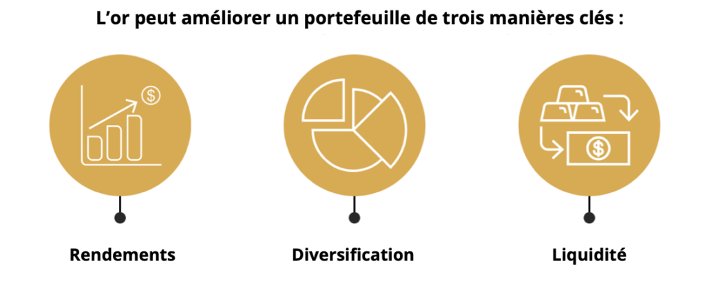 L’or est un actif très liquide, qui n’est la dette de personne, ne comporte aucun risque de crédit et est rare, ce qui lui a permis de conserver sa valeur au fil du temps. Il bénéficie également de sources de demande diverses : en tant qu’investissement, actif de réserve, bijou et composant technologique. Ces caractéristiques signifient que l’or peut améliorer un portefeuille de trois manières principales :