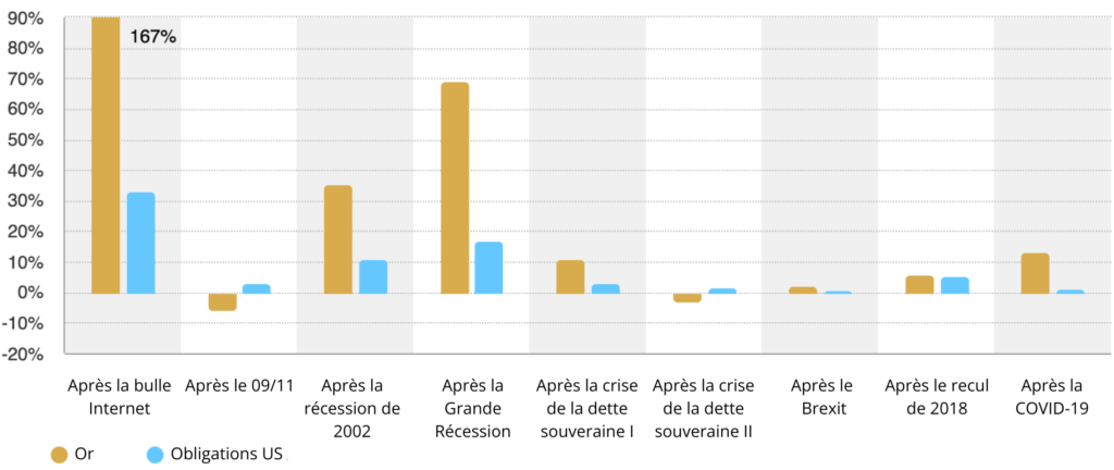 * Au 31 décembre 2025. Calculs de rendement en dollars américains pour les « bons du Trésor américain » : indice Bloomberg Barclays US Treasury ; « or » : cours de l’or LBMA PM. Les dates utilisées sont basées sur les dates de fin du graphique 7. Après la bulle Internet : 3/2001 – 5/2007 ; Après le 11 septembre : 9/2001-11/2001 ; Après la récession de 2002 : 7/2002 – 11/2004 ; Après la crise financière mondiale : 2/2009 – 1/2013 ; Après la crise de la dette souveraine I : 6/2010 – 10/2010 ; Après la crise de la dette souveraine II : octobre 2011 – février 2012 ; Après le Brexit : juin 2016 – juillet 2016 ; Après le recul de 2018 : décembre 2018 – juin 2019 ; Après le recul de 2020 : mars 2020 – juillet 2020.