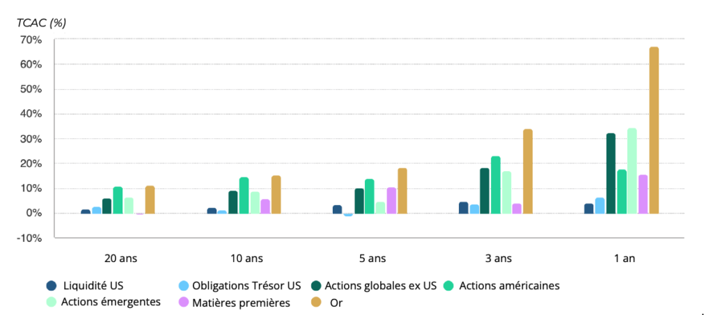 Graphique 1 : L’or a enregistré de bonnes performances au cours des 1, 3, 5, 10 et 20 dernières années, malgré les bons résultats des actifs risqués