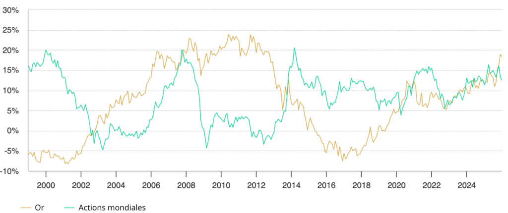 *Au 31 décembre 2025. Rendements annualisés calculés à partir des rendements mensuels basés sur l’indice FTSE Developed Gross Total Return Index et le cours de l’or LBMA PM depuis janvier 1994.