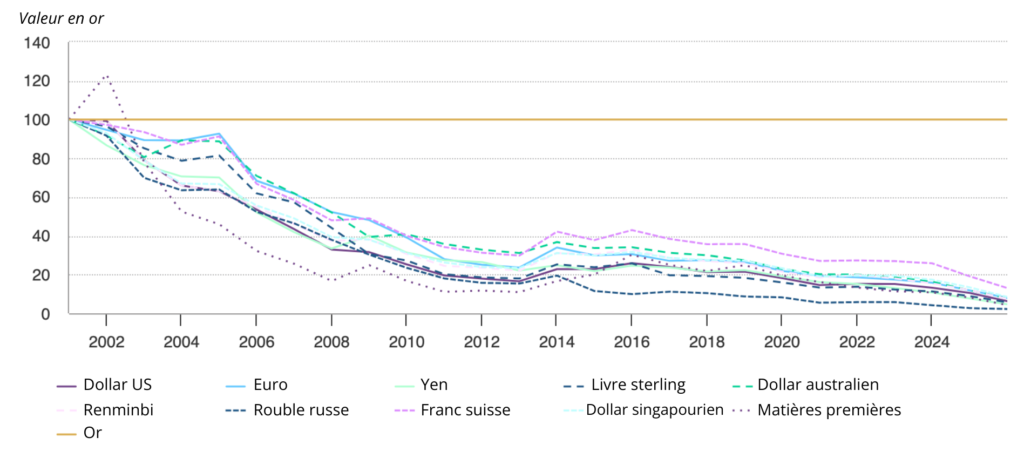 *Au 31 décembre 2025. Valeur relative entre « l’or » : LBMA Gold Price PM ; « les matières premières » : Bloomberg Commodity Index ; et les principales devises depuis 2000. Valeur des matières premières et des devises mesurée en onces d’or, indexée à 100 en janvier 2000.