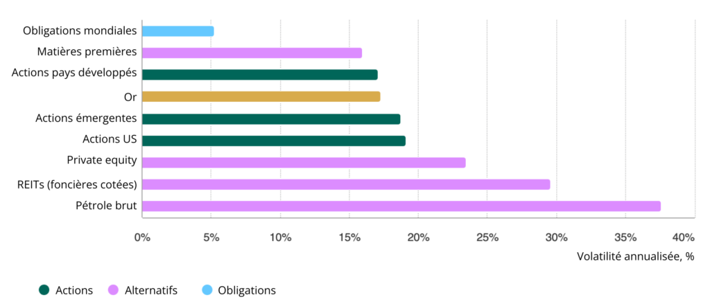 *La volatilité annualisée est calculée sur la base des rendements quotidiens en dollars américains entre le 31 décembre 2005 et le 31 décembre 2025. Indices utilisés : Bloomberg Global Aggregate Bond Index ; Bloomberg Commodity Index ; MSCI Daily Gross World Index ; LBMA Gold Price PM ; MSCI Daily Gross EM ; MSCI USA Index ; S&P Listed Private Equity Index ; FTSE Nareit Equity REITs Index USD ; Bloomberg WTI Crude Oil.